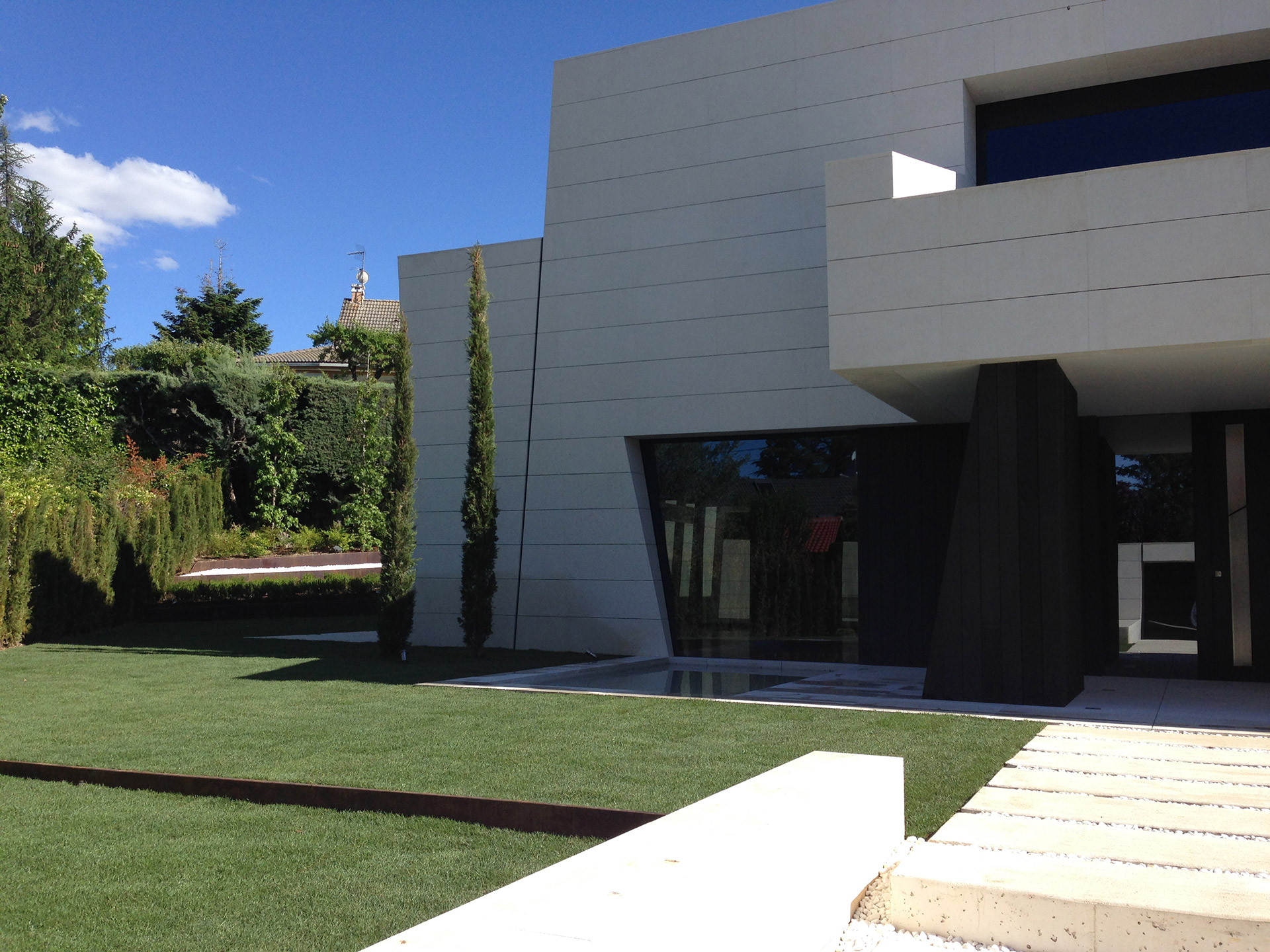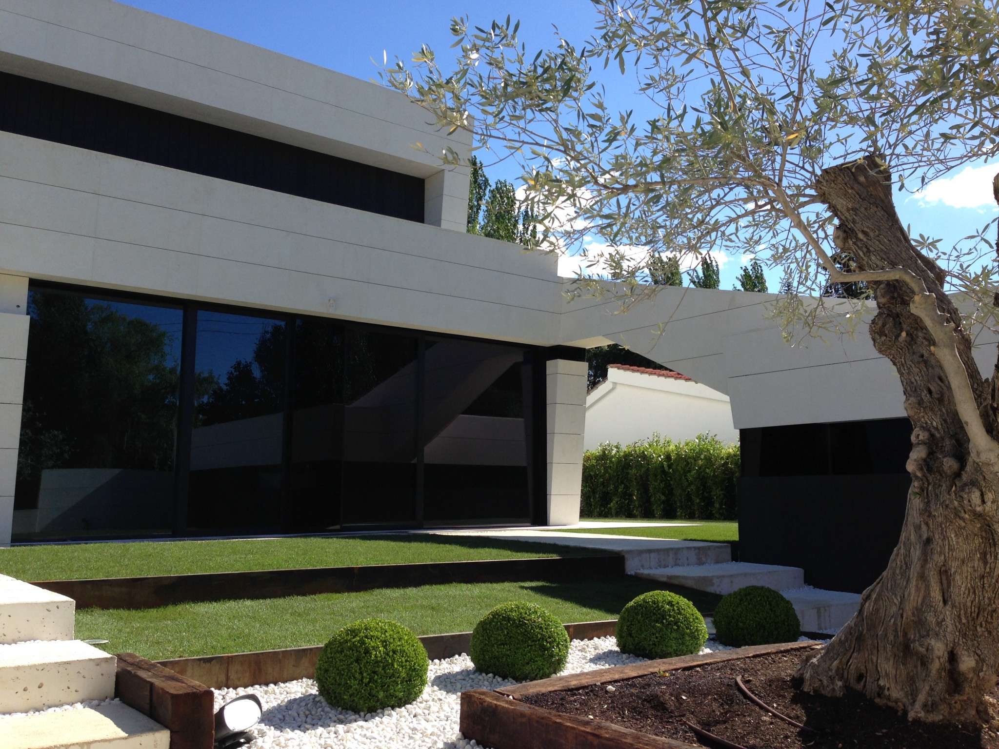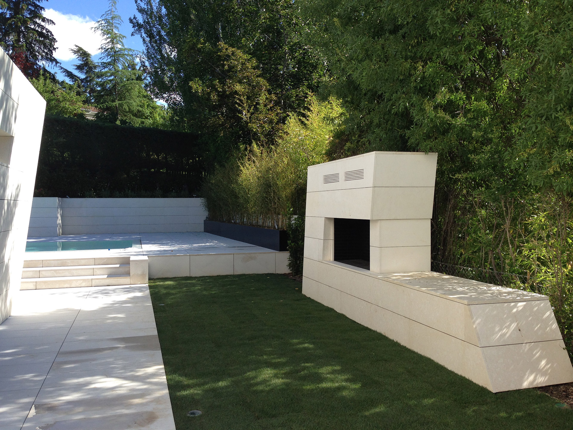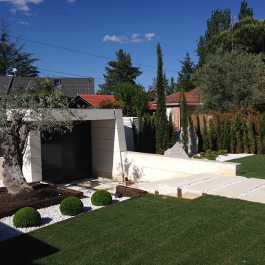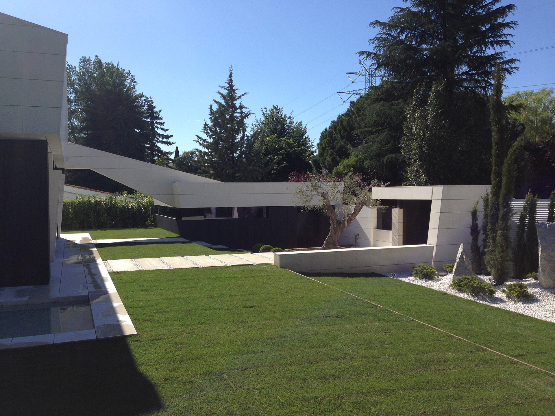 Diseño de jardinería minimalista acorde al diseño de la vivienda, al igual que los muebles elegidos para comedor, terraza-estar y tumbonas. Barbacoa realizada con los mismos criterios y materiales que la estructura de la vivienda.