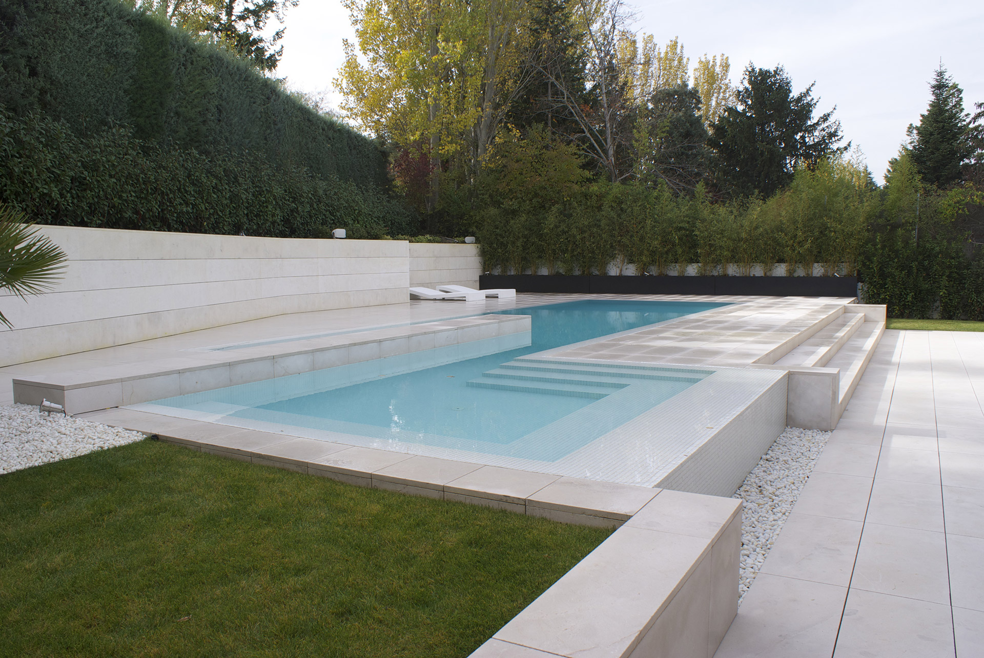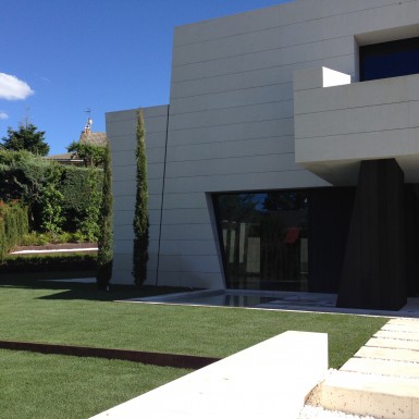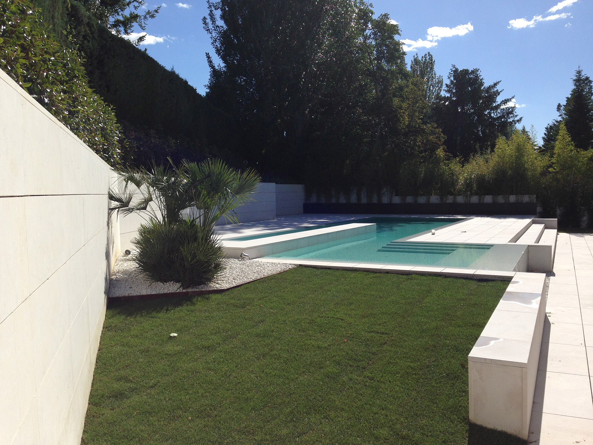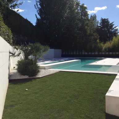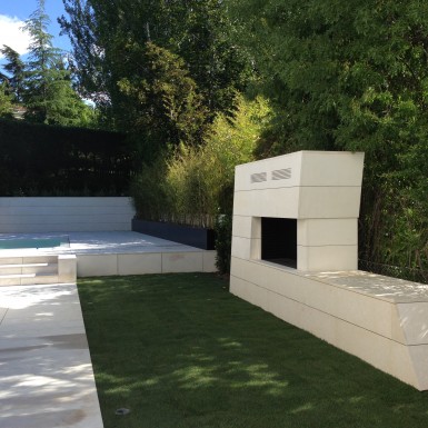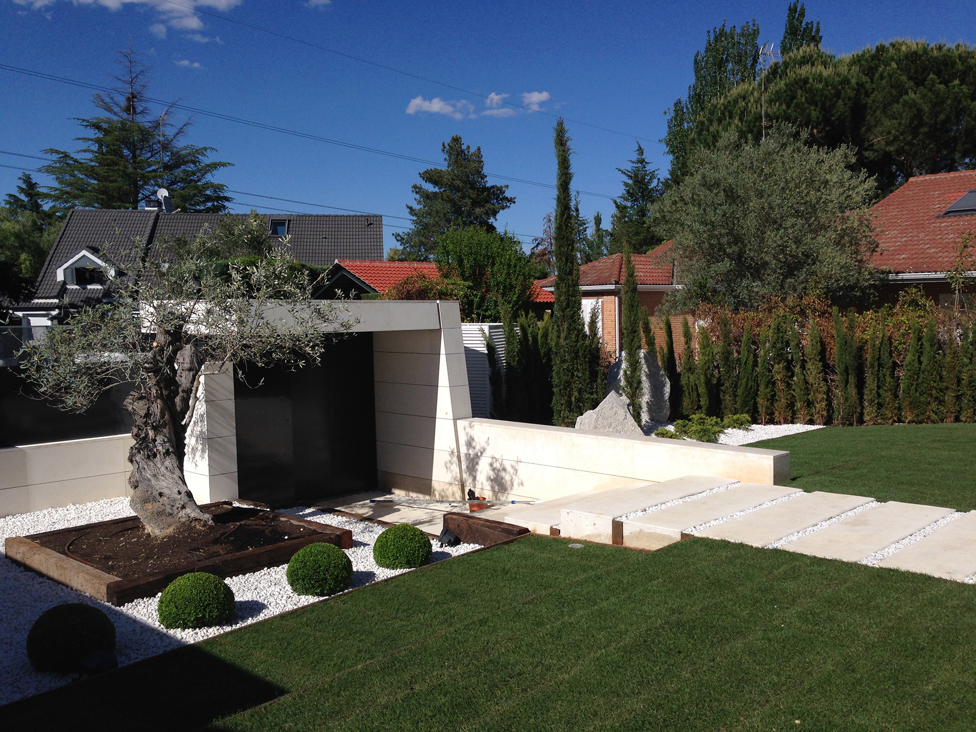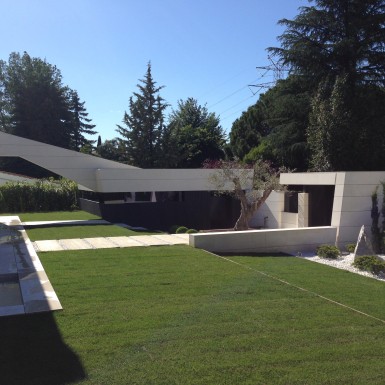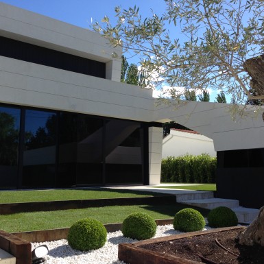 Diseño de jardinería minimalista acorde al diseño de la vivienda, al igual que los muebles elegidos para comedor, terraza-estar y tumbonas. Barbacoa realizada con los mismos criterios y materiales que la estructura de la vivienda.