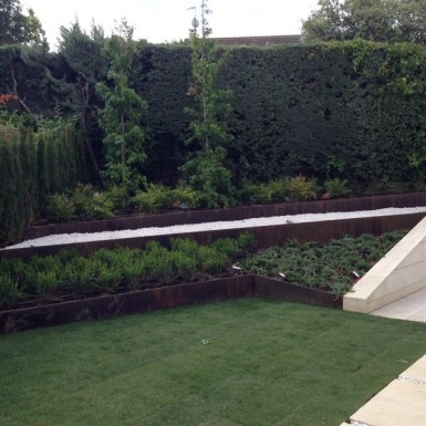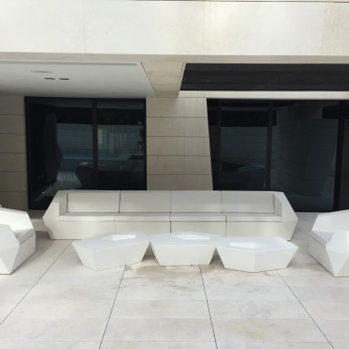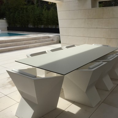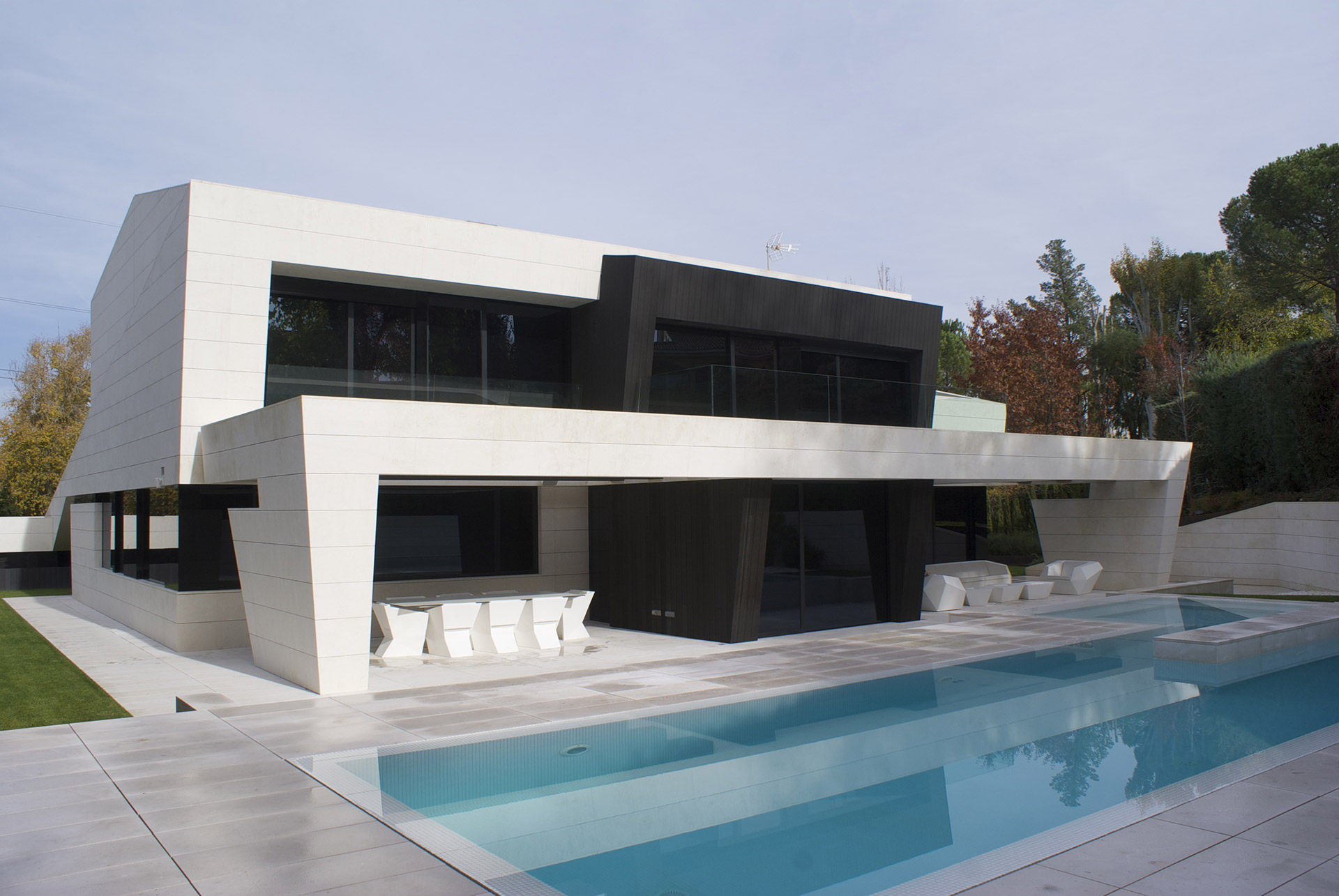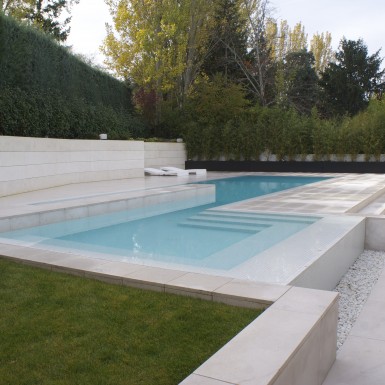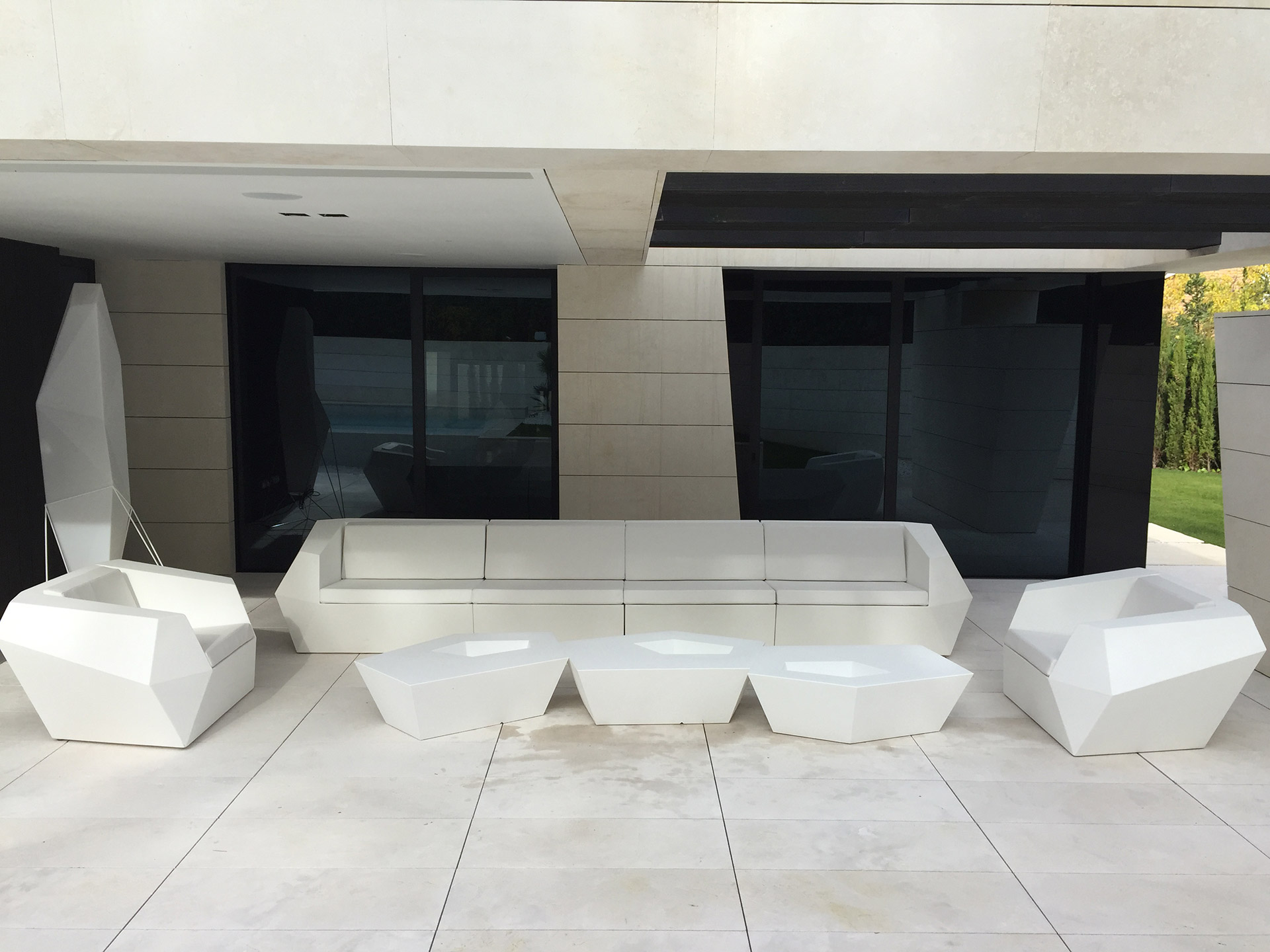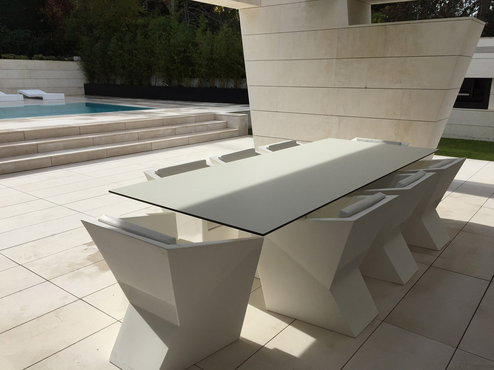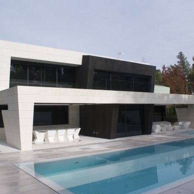 Diseño de jardinería minimalista acorde al diseño de la vivienda, al igual que los muebles elegidos para comedor, terraza-estar y tumbonas. Barbacoa realizada con los mismos criterios y materiales que la estructura de la vivienda.