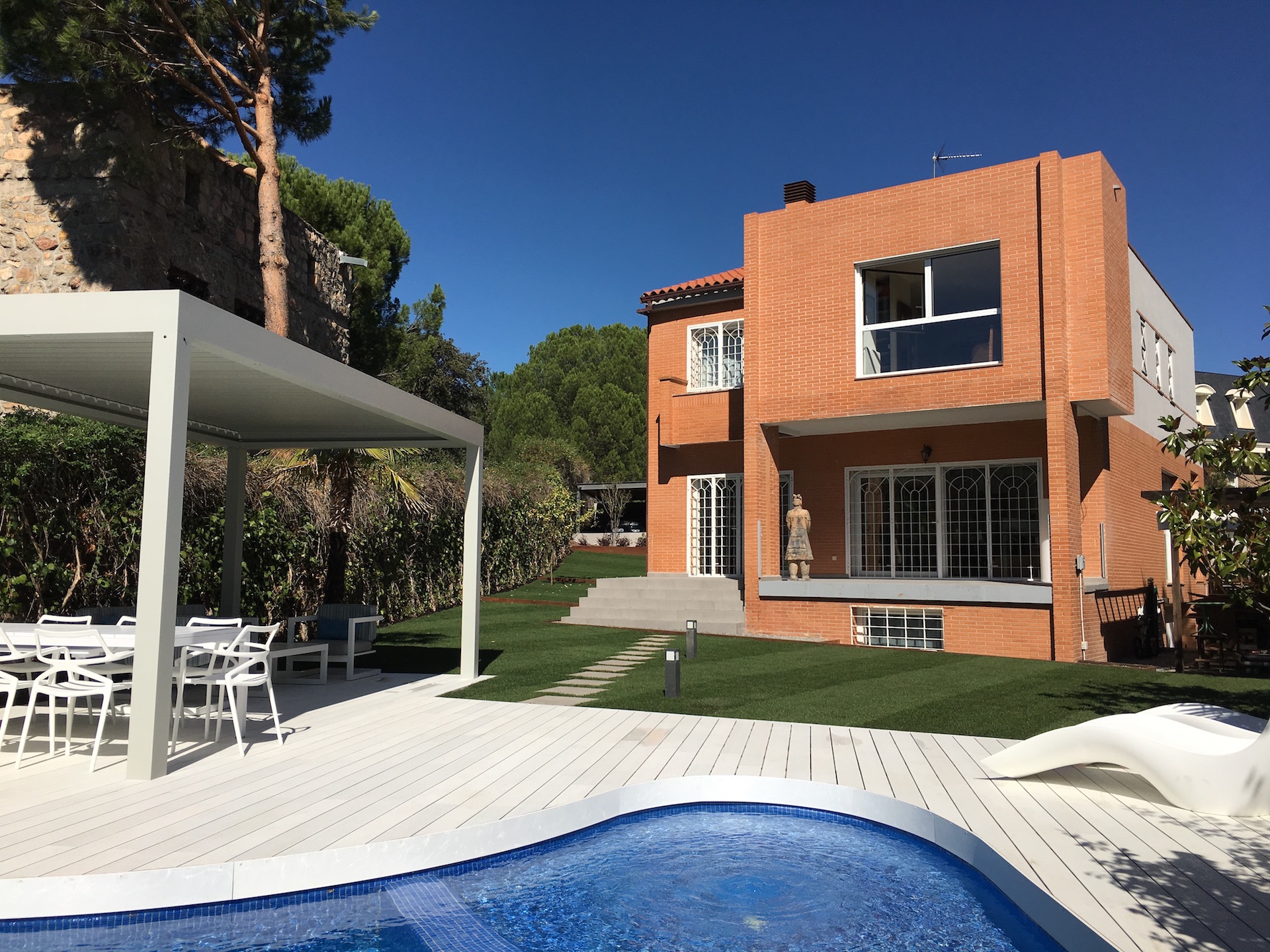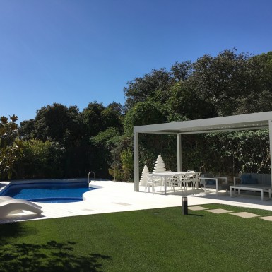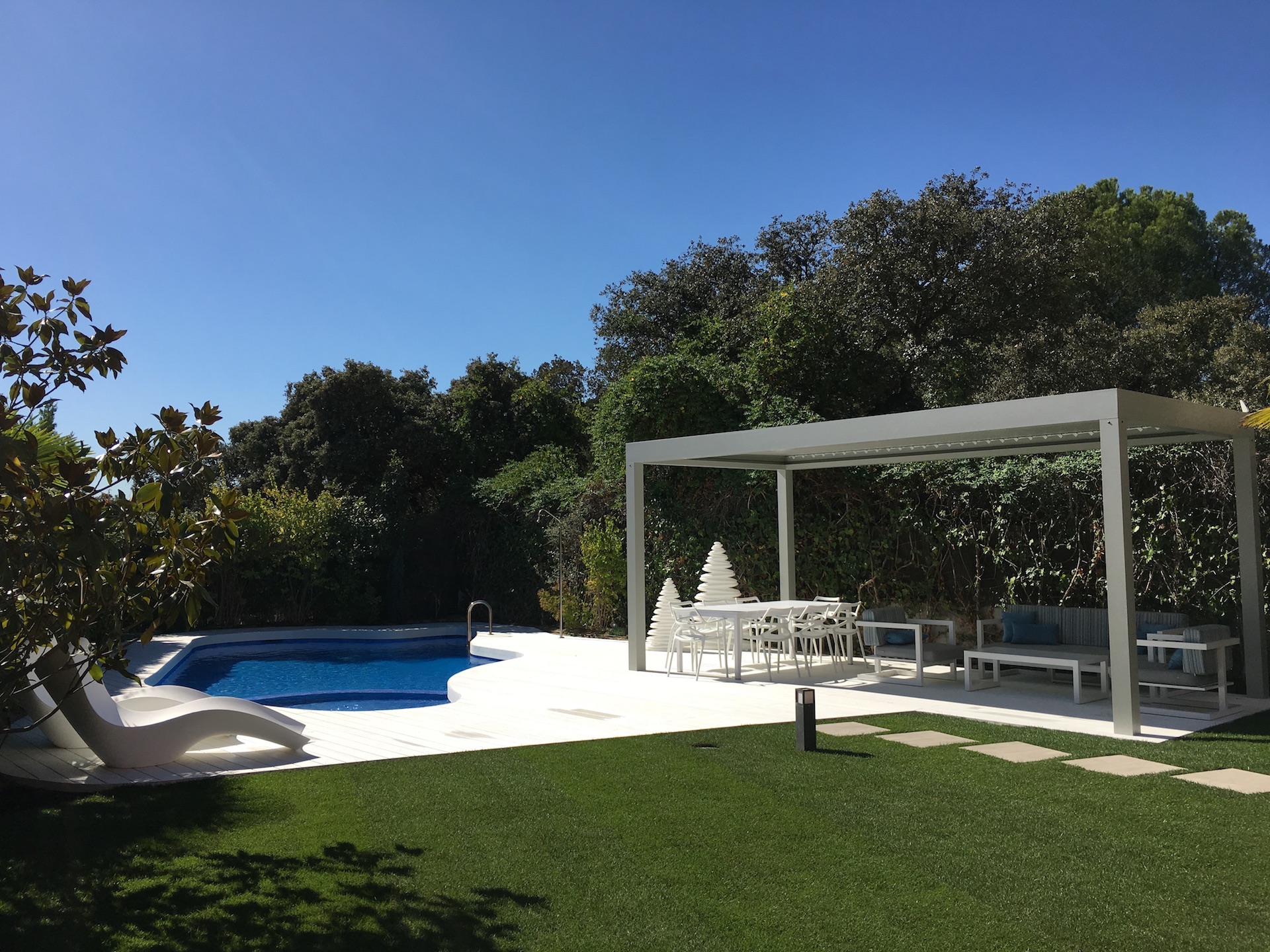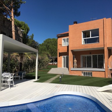 Reforma dirigida a conseguir modernizar el aspecto exterior de la vivienda, con la ampliación del dormitorio principal y la cocina, creando dos cuerpos geométricos limpios que protagonizan la nueva imagen. Se diseñan el jardín, zona de piscina y nueva zona de aparcamiento exterior.